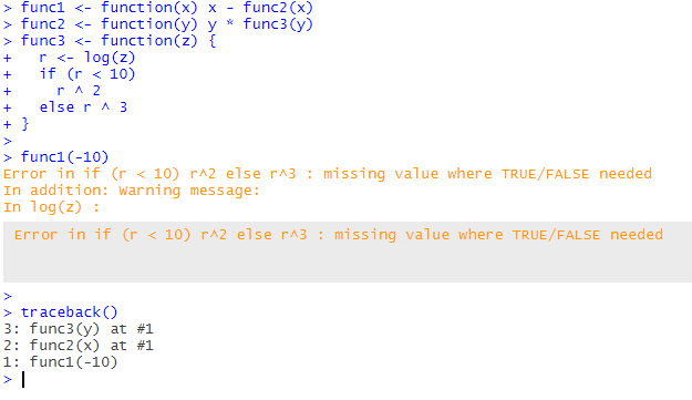 Another way we can use traceback(), besides inserting it directly into the code, is by using traceback() as an error handler (meaning that it will call immediately if any error occurs). This can be done using options(error = traceback).